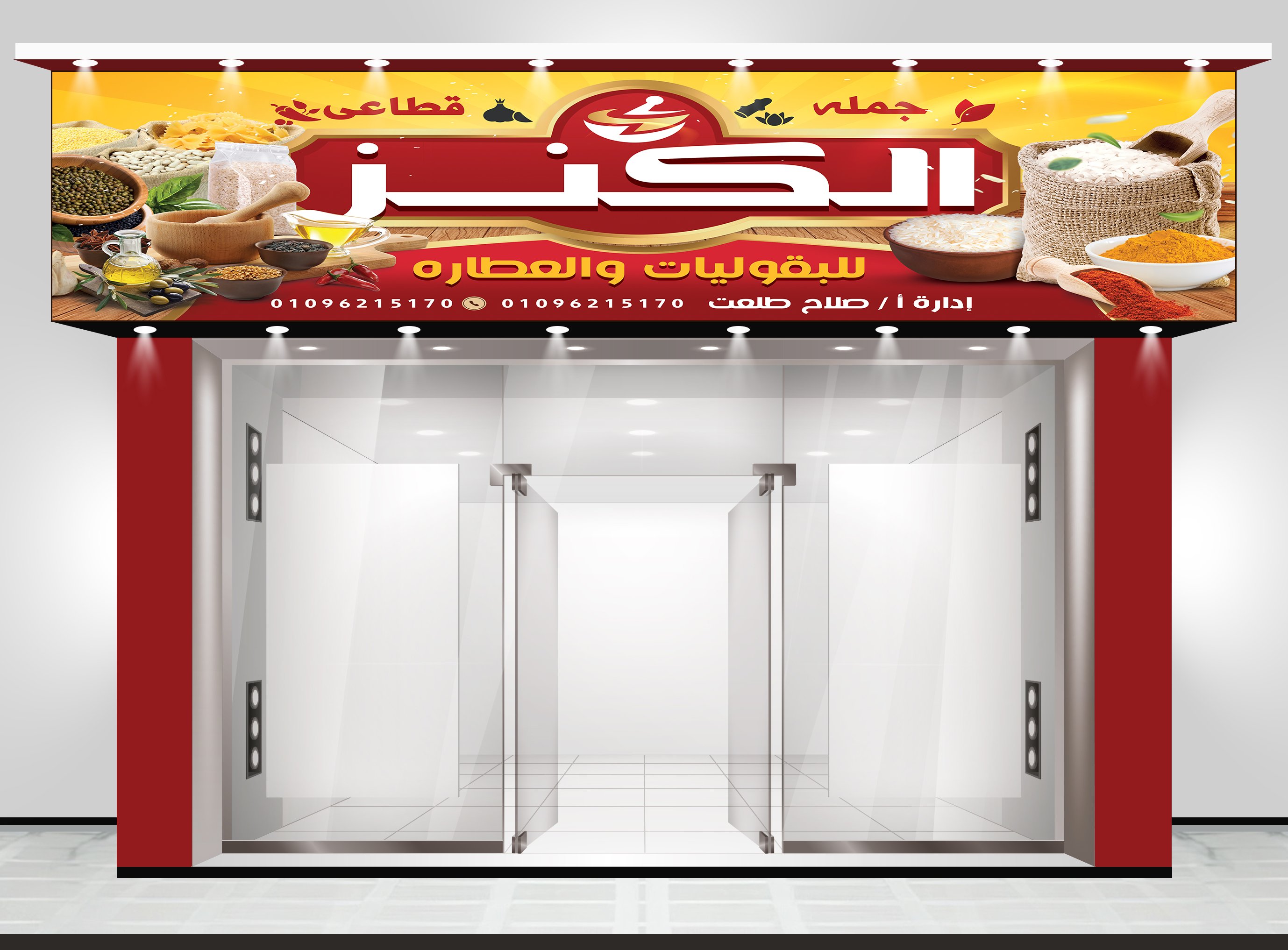 عدد 3 تصميم يافطة محل بيع بقوليات بحجم 2 متر + كارت شخصي